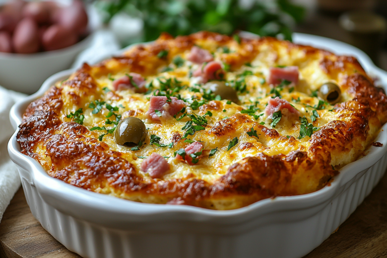 Добавляю 50 г нарезанной кубиками ветчины из индейки, нарезанный маринованный огурчик и 4 разрезанные пополам маслины. Аккуратно перемешиваю. Массу выливаю в жаропрочную форму, сверху посыпаю 60 г тертого сыра. Выпекаю в разогретой до 180°C духовке 30 минут до золотистой сырной корочки. Подаю слегка остывшим.