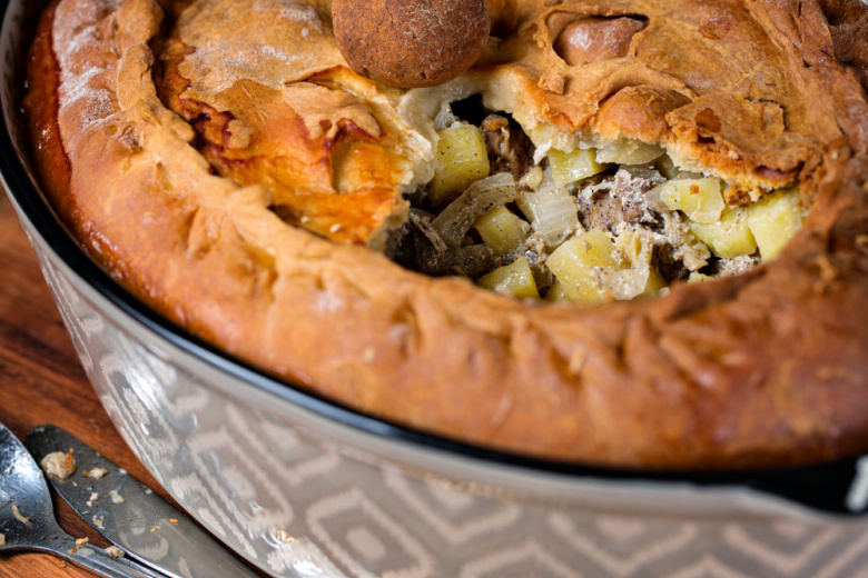 Для приготовления вам понадобится: для теста — 500 г муки, 250 мл кефира, 100 г сливочного масла, 1 ч. л. соли, 1 ч. л. сахара; для начинки — 800 г баранины или говядины, 5–6 картофелин, 2 луковицы, 100 мл крепкого мясного бульона, соль, перец. Замесите мягкое тесто из теплого кефира, растопленного масла, муки, соли и сахара, дайте ему отдохнуть 30 минут. Мясо и картофель нарежьте средними кубиками, лук — полукольцами, посолите и поперчите. Тесто разделите на две неравные части. Большую часть раскатайте в круг и выложите в глубокую форму, сформировав бортики. Выкладывайте начинку слоями: мясо, лук, картофель, повторяя, пока форма не заполнится. В центре оставьте отверстие. Накройте второй лепешкой, защипните края. В отверстие аккуратно влейте охлажденный бульон. Выпекайте при 180 °C 1,5–2 часа до румяной корочки. Подавайте теплым, разрезая на сегменты, чтобы сок не вытек.