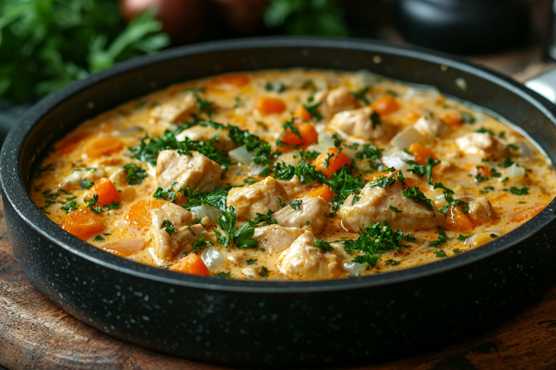 Это по-домашнему вкусное горячее. Оно получается бархатистым и насыщенным: нежная курица, сладковатые тушеные овощи и густой сметанный соус создают идеальную гармонию.