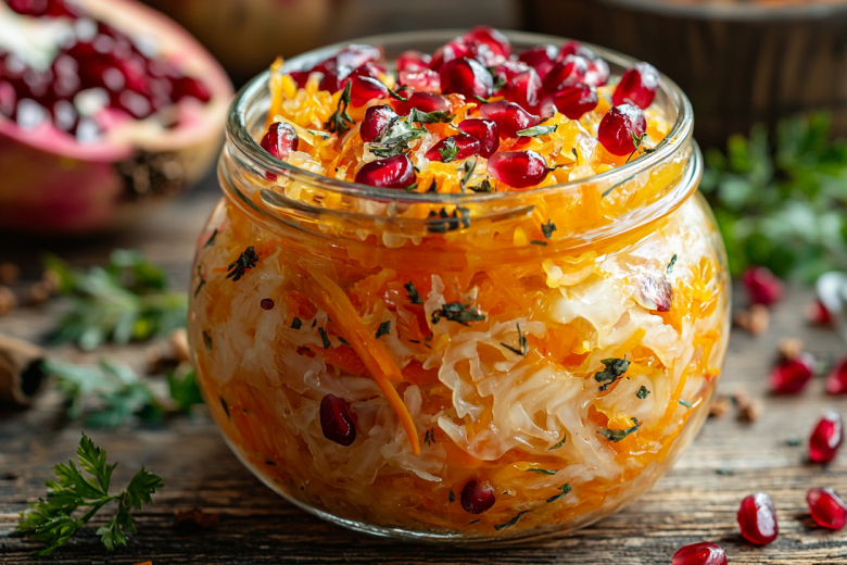 Кислинка квашеной капусты и сладковато-терпкие гранатовые зерна создают идеальный дуэт. Морковь добавляет ноту сладости, а соль выстраивает между ними баланс. Получается не просто заготовка, а готовый сложный и очень полезный салат.